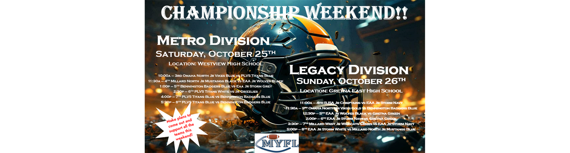 Our league offers players and teams the best chance of competing at the highest level in the Greater Omaha Metro area.  Teams are encouraged to compliment the school football programs in order to best prepare players, and to gain the experience needed to succeed at the next level of play. Through coordination with area high schools,  MYFL games take place on some of the best high school fields with the best certified referee crews.